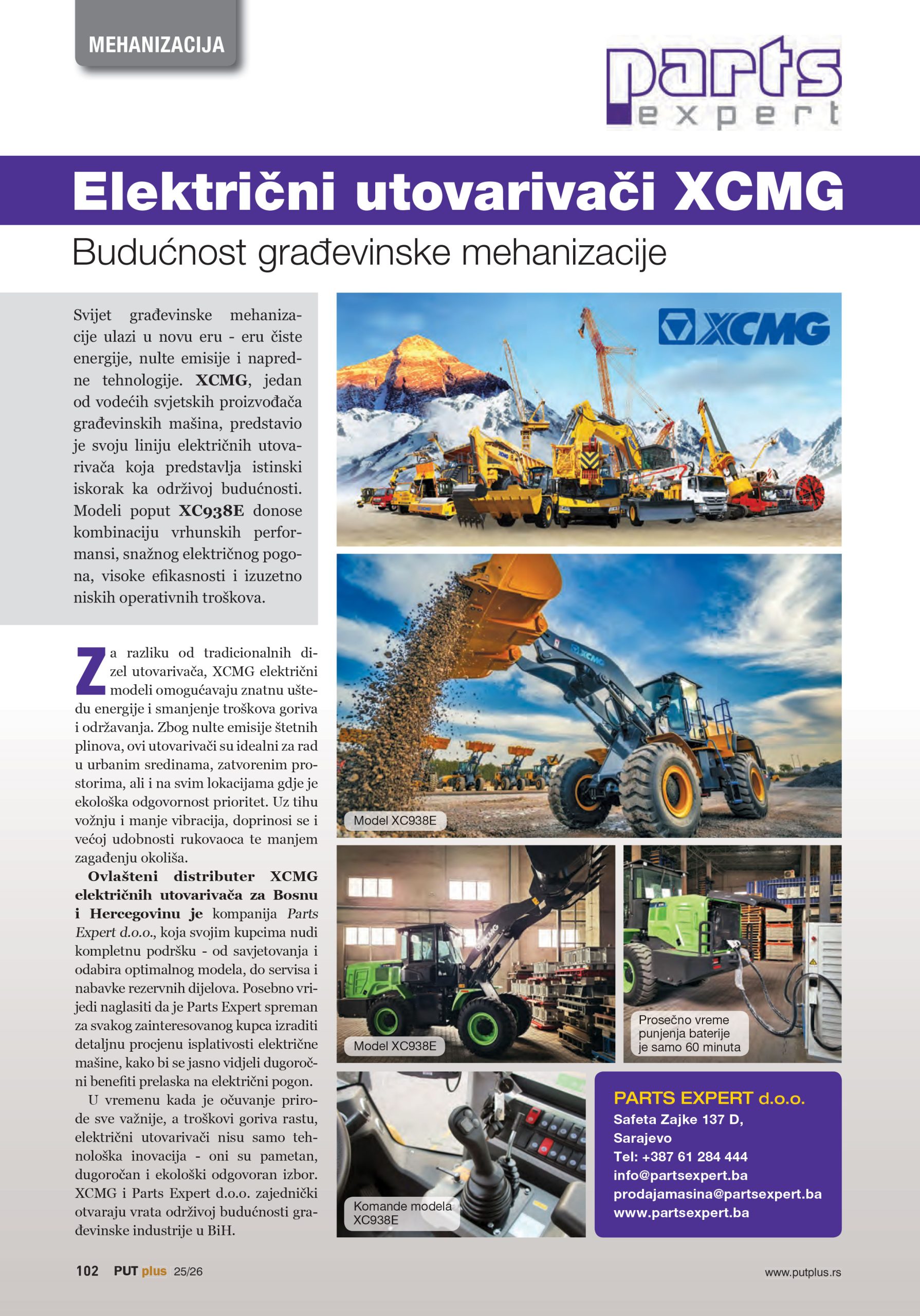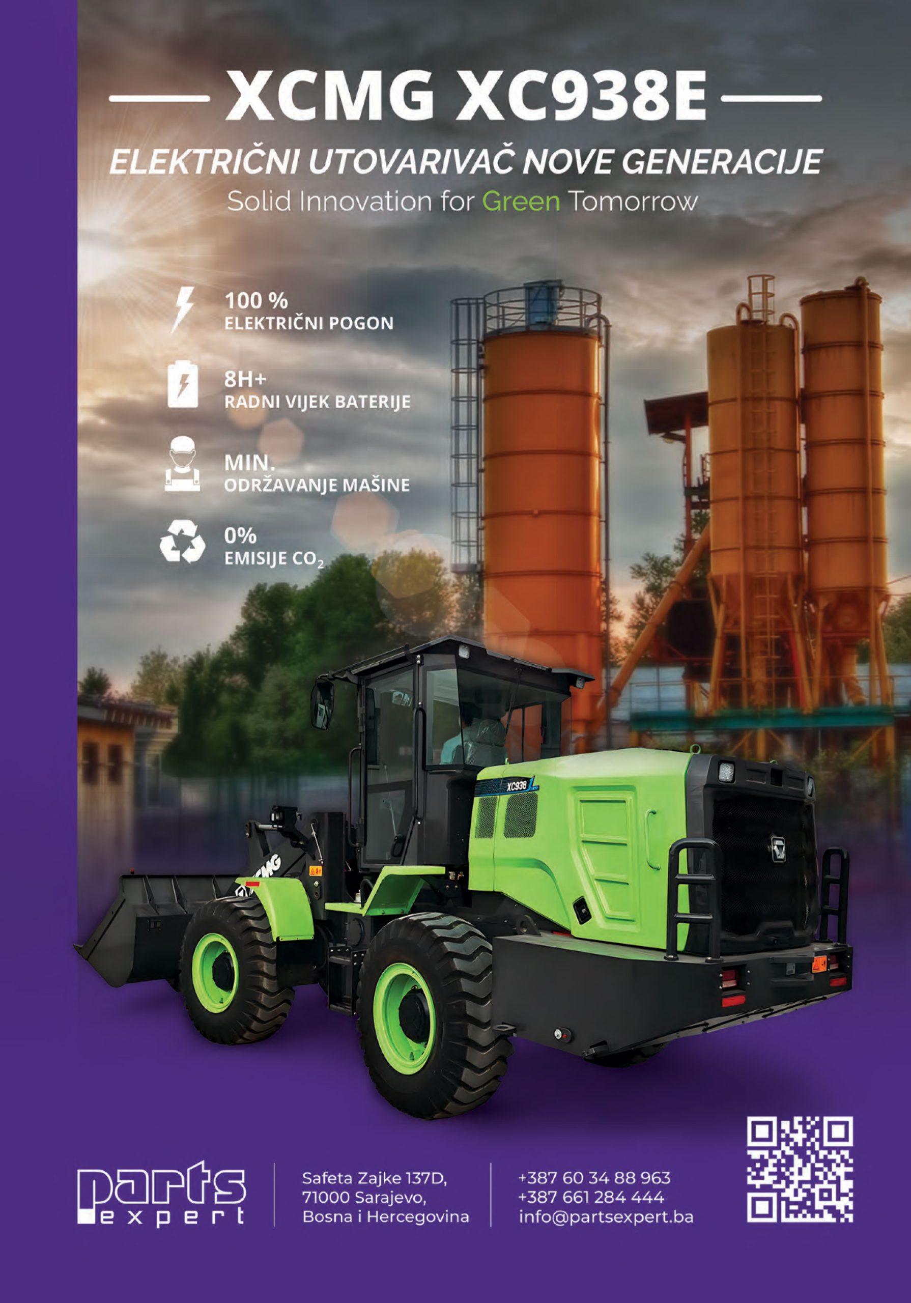 U najnovijem izdanju Regionalnog almanaha niskogradnje i saobraćaja PUT PLUS 2025/2026, Parts Expert d.o.o. predstavlja budućnost građevinske mehanizacije – XCMG električni utovarivač nove generacije XC938E.